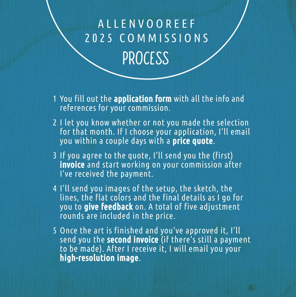 Thank you for your interest! To apply for a commission from me, you'll need to fill out the form when it goes live. In the meantime, this page contains all the questions the form has, so you'll know what to prepare for.Limited slots will be available each month. I will choose between 1-3 applications every time based on what I have time for and what appeals to me! If you don’t make the cut this month, you’re welcome to re-apply another time. (You'll be able to re-enter the same form, so don't worry about having to fill it out again, unless your request has changed!)Below you'll find all the information about prices, terms & conditions and the process. Just to make sure you and I both know what we're in for.If you have any questions, feel free to send me an email (allenvooreef[@]gmail.com), or a DM through blue sky, tumblr or instagram 🙂 I look forward to working with you!